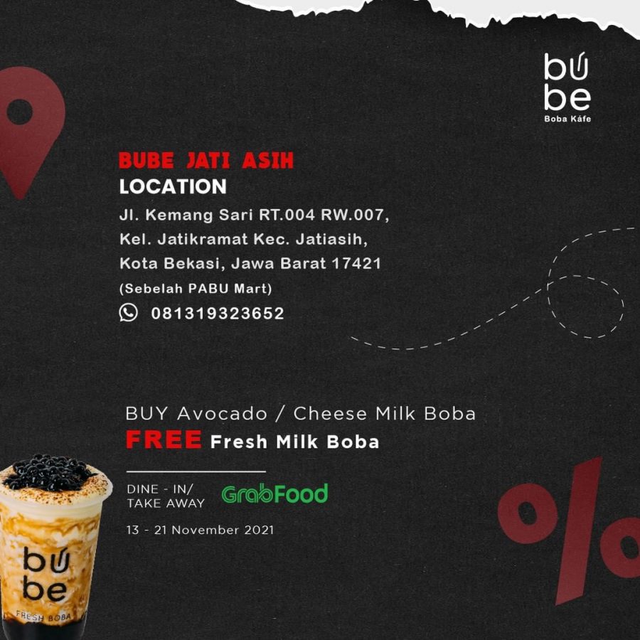 Mulai tanggal 13 – 21 November, nikmati PROMO BUY 1 CHEESE/AVOCADO MILK BOBA, GET 1 FREE FRESH MILK BOBA berlaku untuk DINE IN • TAKE AWAY • GOFOOD • GRABFOOD & SHOPEEFOOD* (slide untuk informasi lebih lanjut).