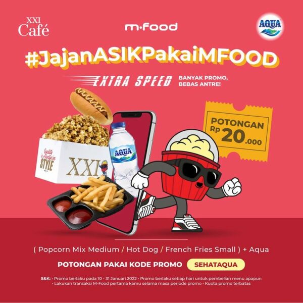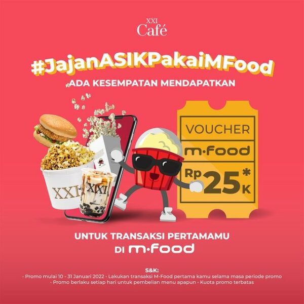 Promo XXI CAFE Weekend ASIK Pake M-FOOD β Combo Popcorn Salt (S) + Coca Cola (S) cuma Rp. 20.000 hanya berlaku setiap hari Sabtu dan Minggu di bulan Januari 2022