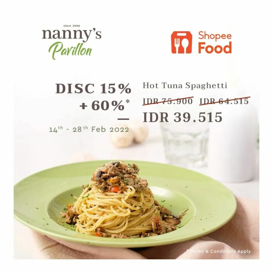 Nanny’s Pavillon Promo Discount 15% Off + Extra 60% Off Khusus Pemesanan Via ShopeeFood. berlaku tanggal 14 – 28 Februari 2022