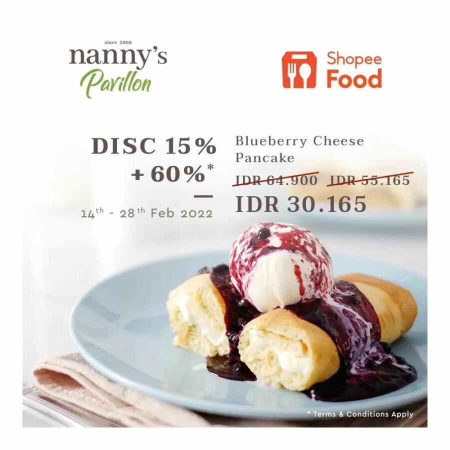 Nanny’s Pavillon Promo Discount 15% Off + Extra 60% Off Khusus Pemesanan Via ShopeeFood. berlaku tanggal 14 – 28 Februari 2022