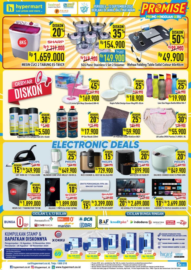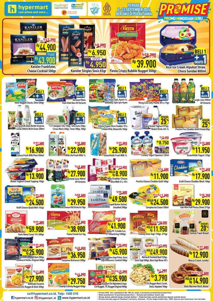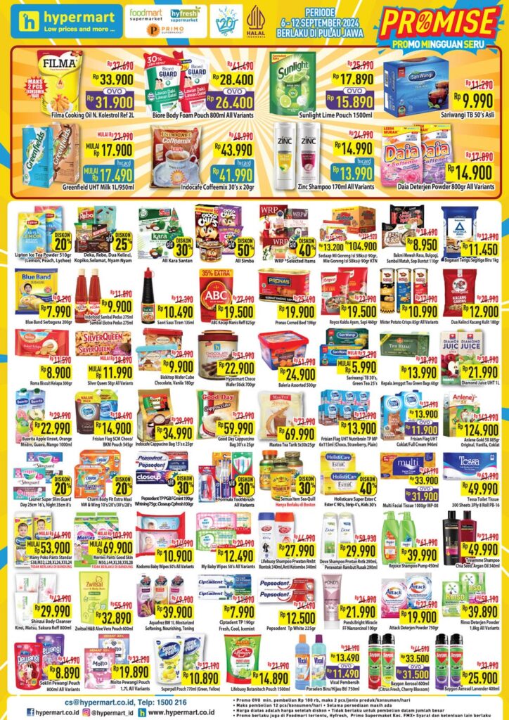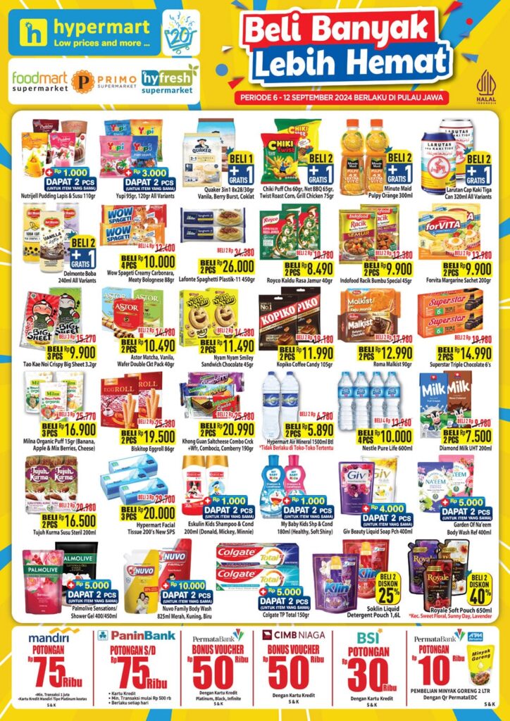 Nikmati promo Hypermart Promo Mingguan Seru di area Jawa periode 06-12 SEPTEMBER 2024 untuk berbagai kebutuhan harian Anda! Temukan harga spesial untuk produk segar, bahan makanan, hingga barang kebutuhan rumah tangga. Jangan lewatkan kesempatan untuk belanja hemat dengan penawaran berikut: